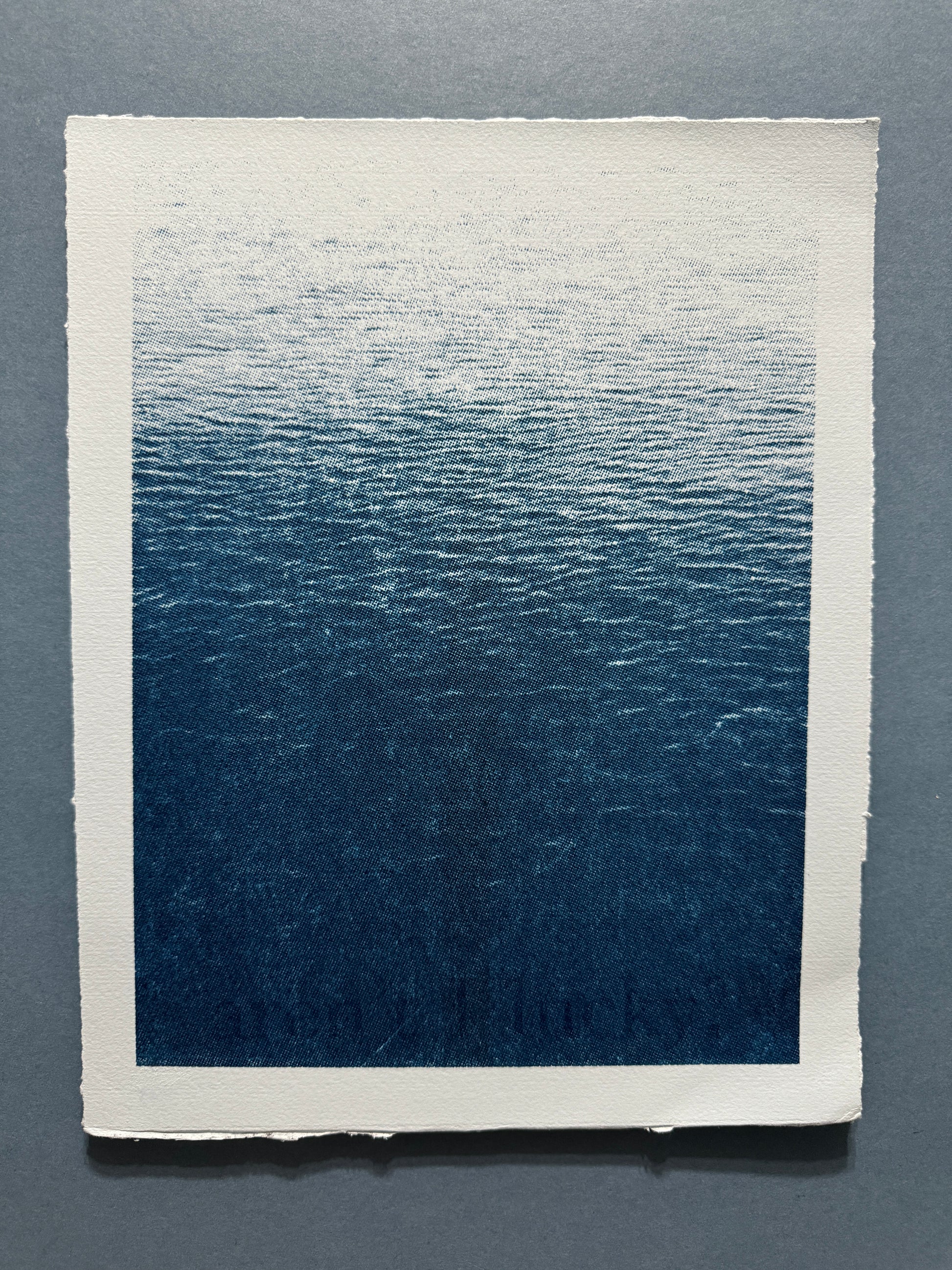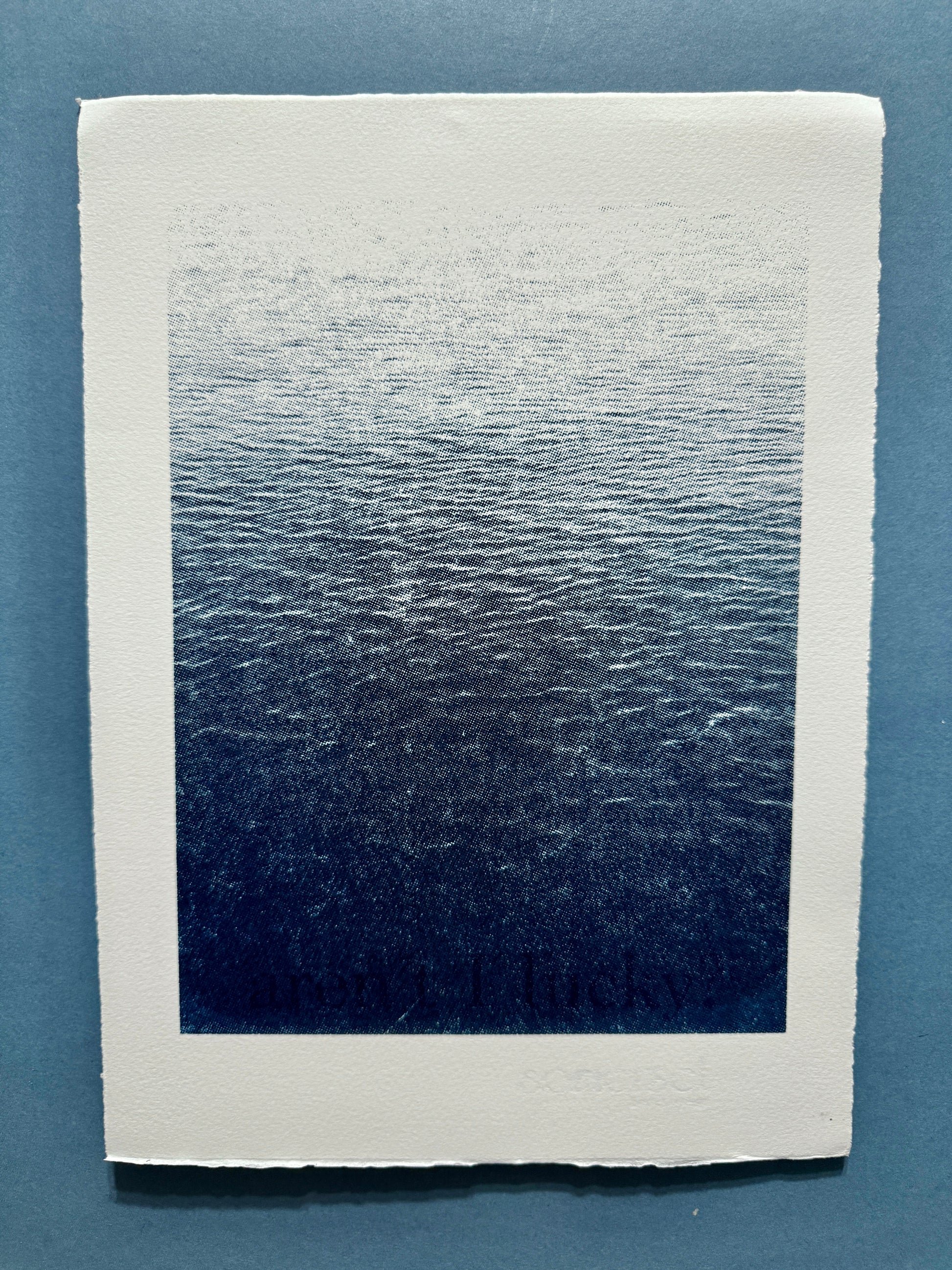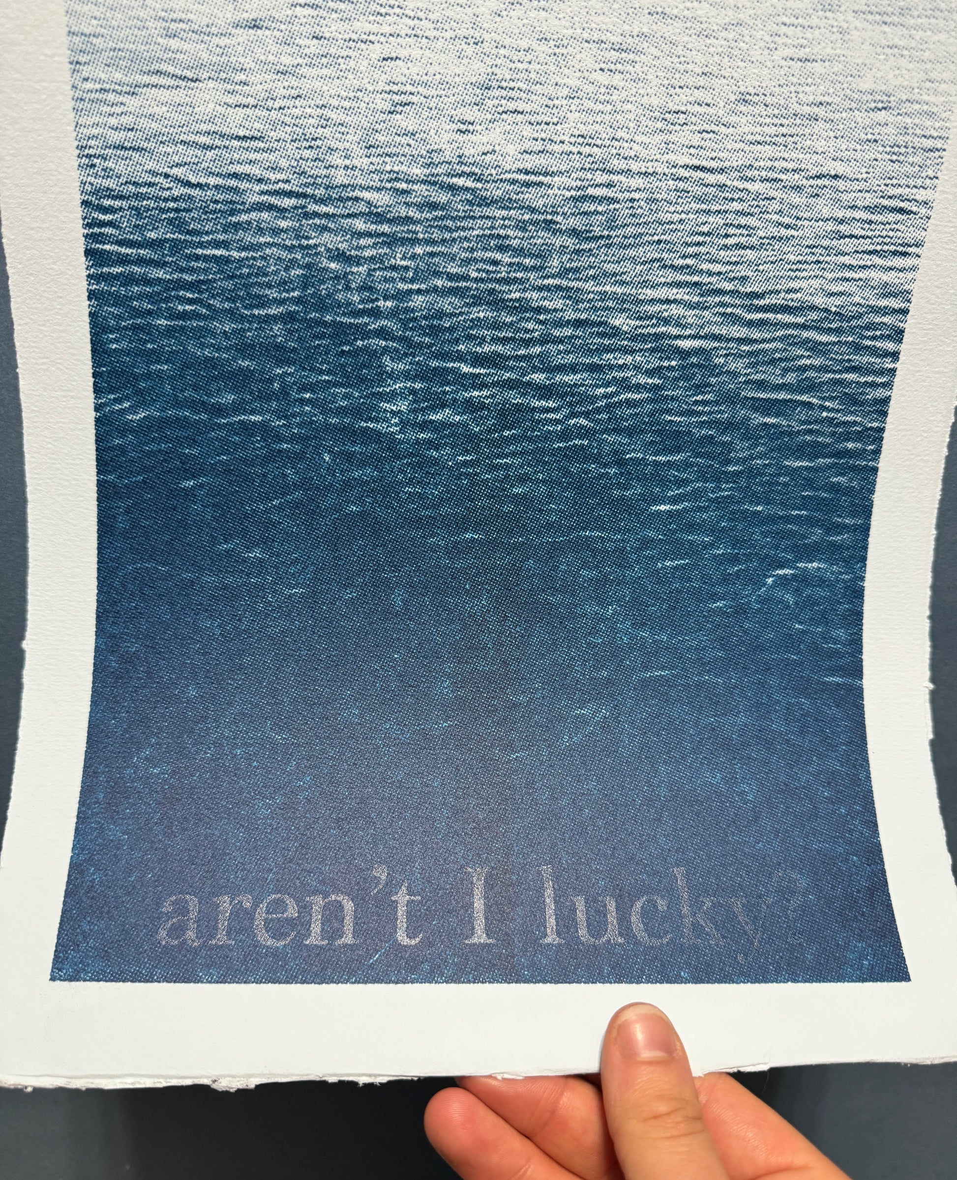 The text "Aren't I Lucky?" is in memory of my amazing late (Aunt) Megan. As I had rediscovered a video I took of the water in Wellington as she spoke to a stranger about having the week off from work and enjoying the beautiful weather we were having all those years ago. The print speaks to memory, love, and how any time we have with our loved ones is more special than we truly thought.