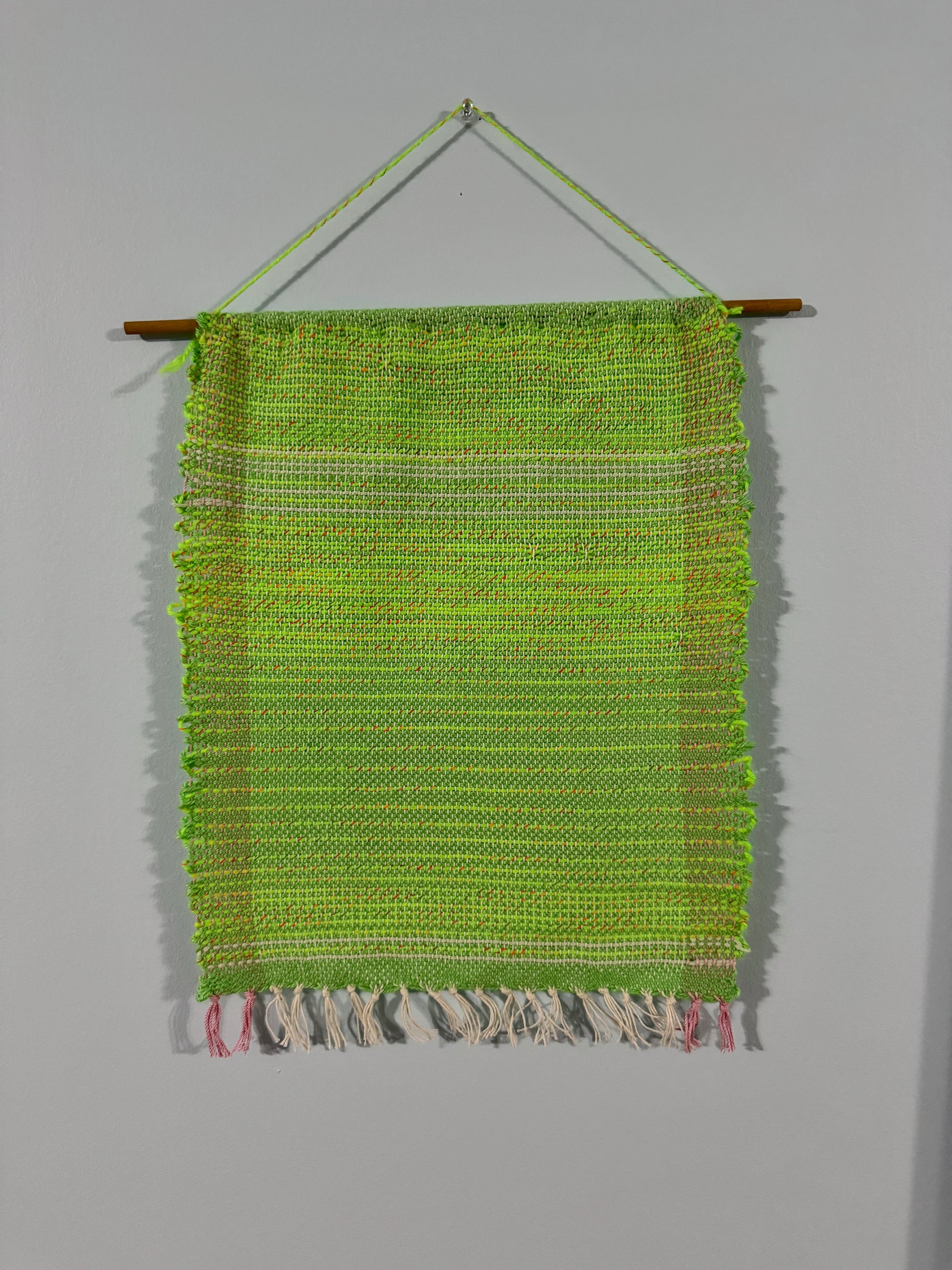 This large colourful yet electric green weaving was hand woven with acrylic and cotton yarn.