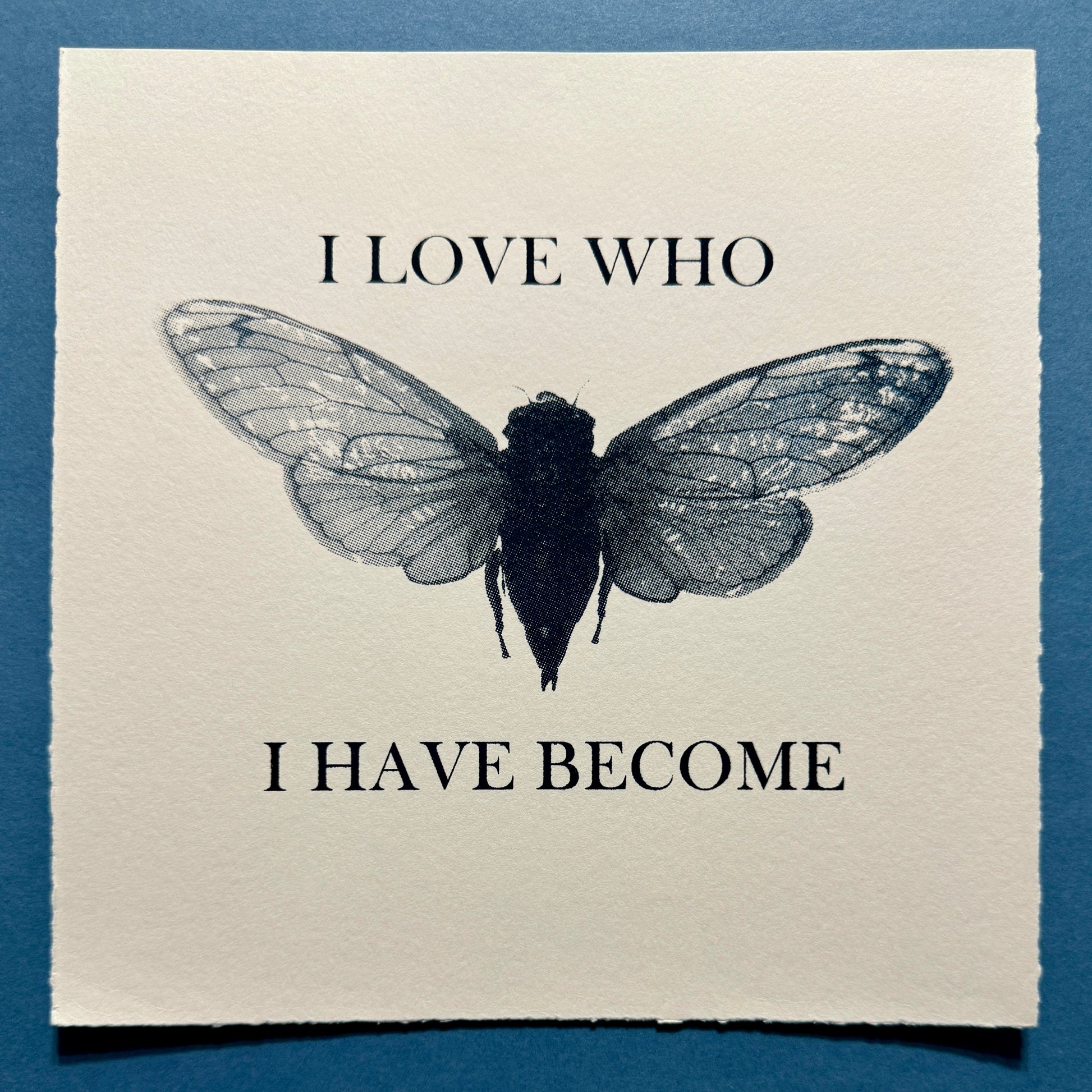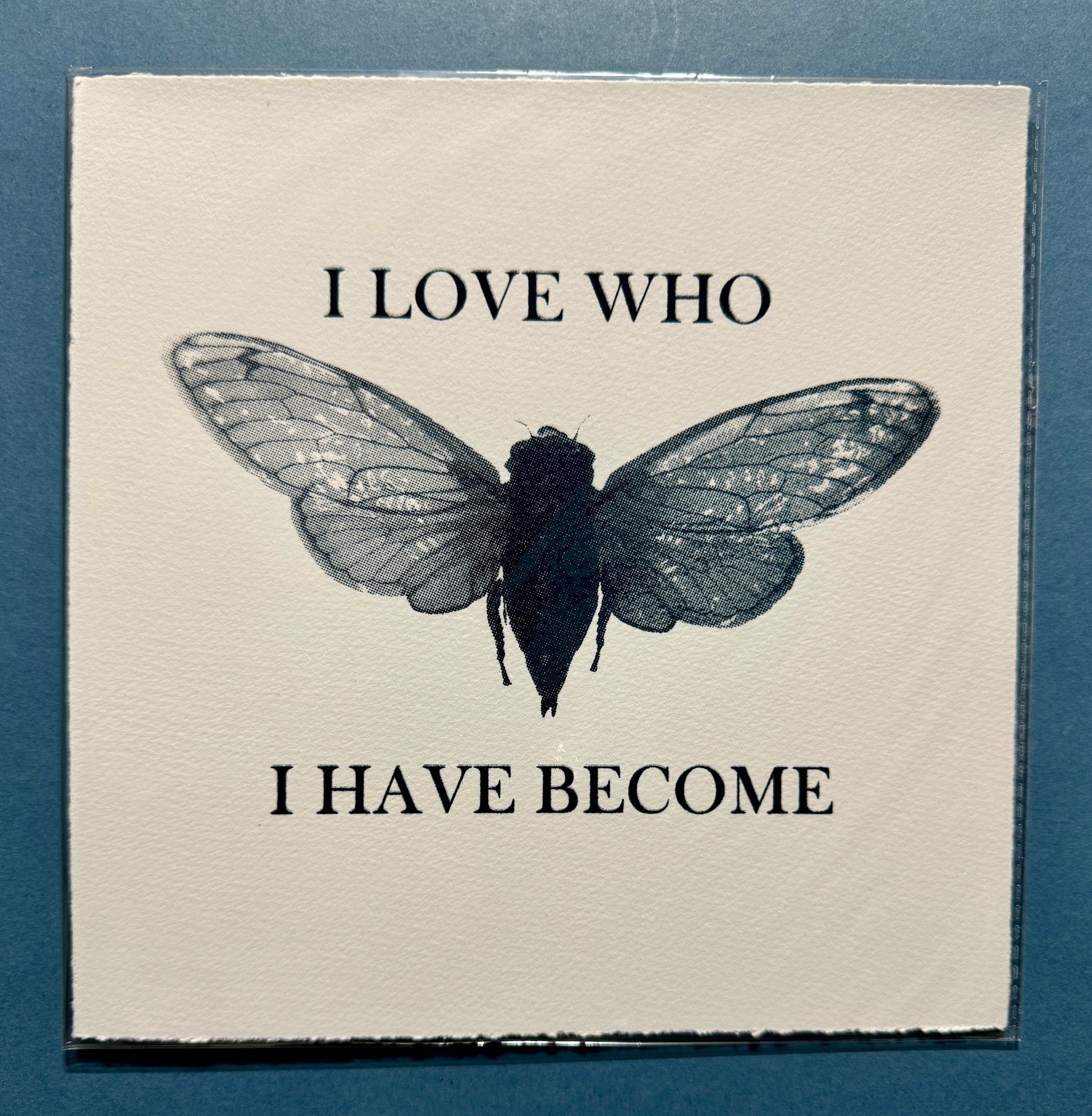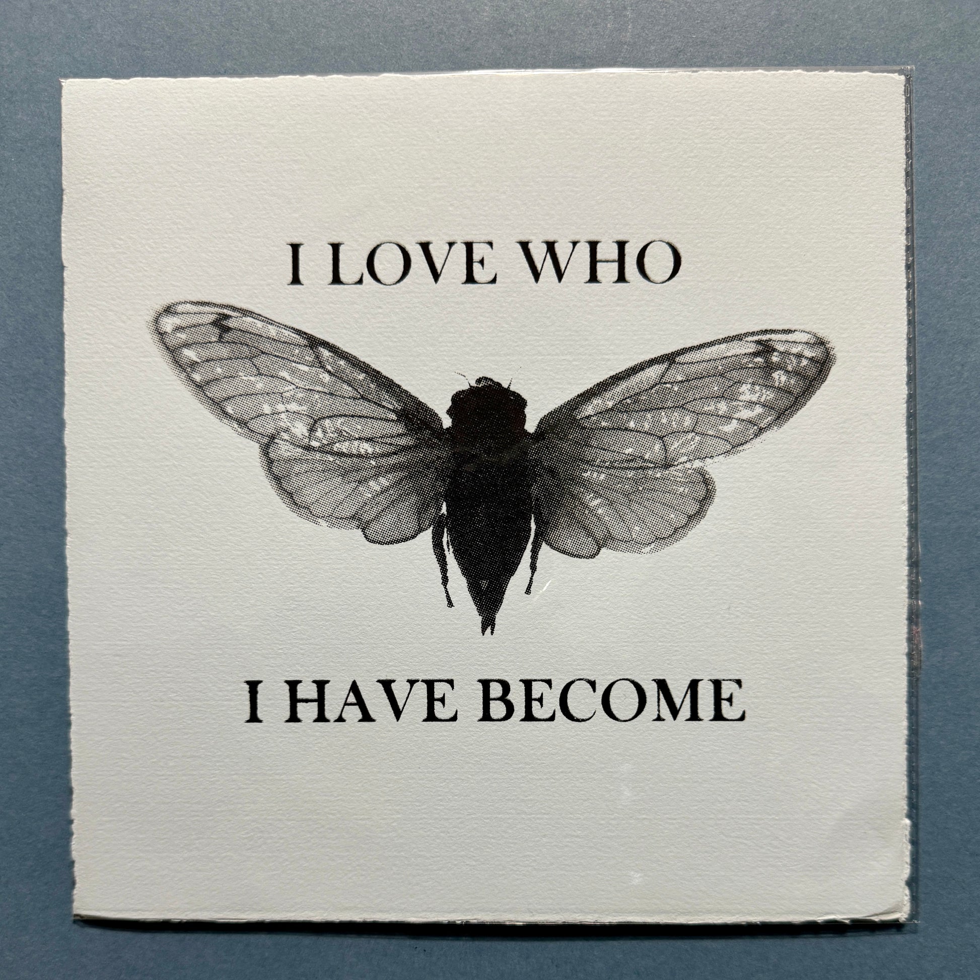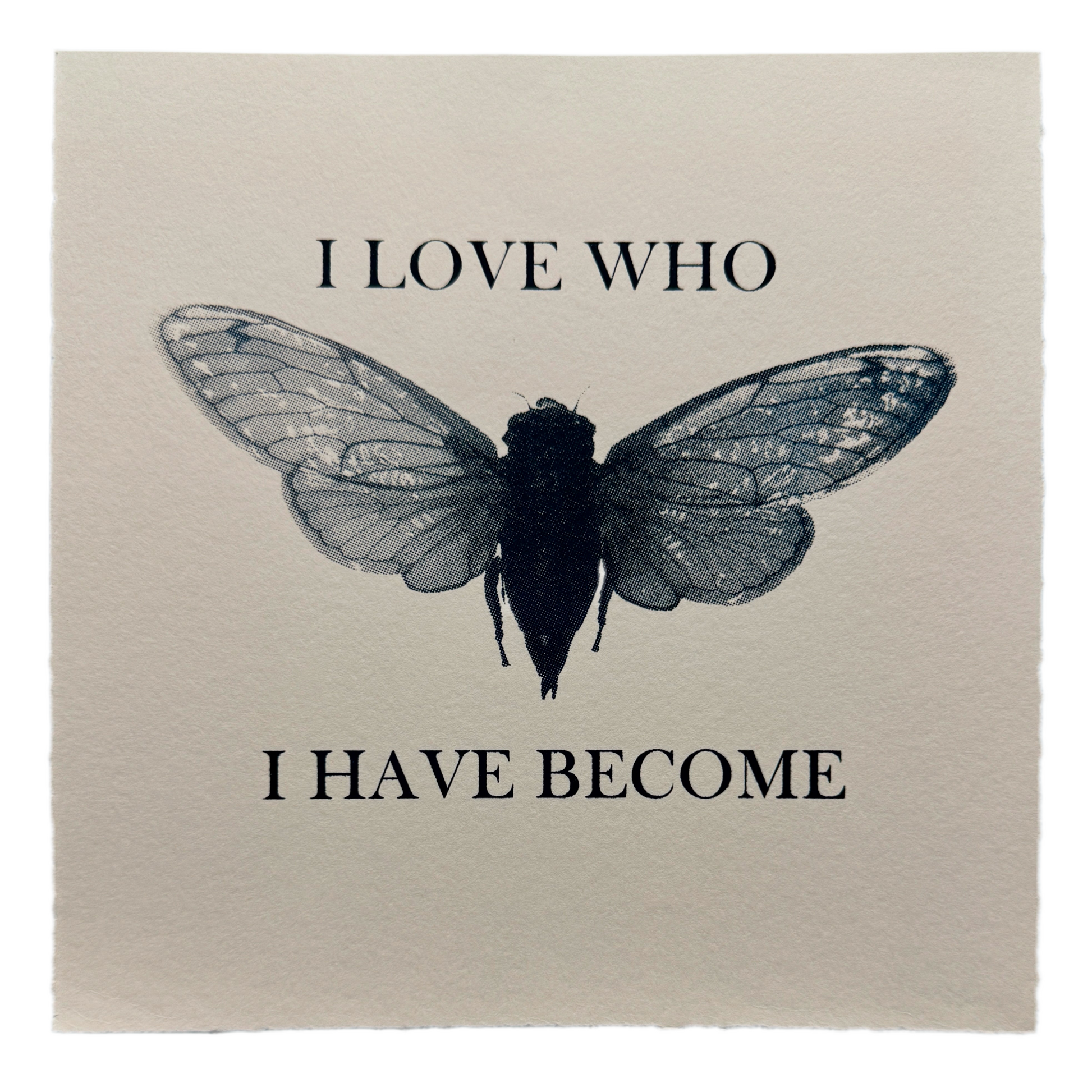 I Love Who I've Become is a screen printed series of cicadas in variations of colour ink and paper. Because we all are different people, I chose to print this design using a variety of ink colours.