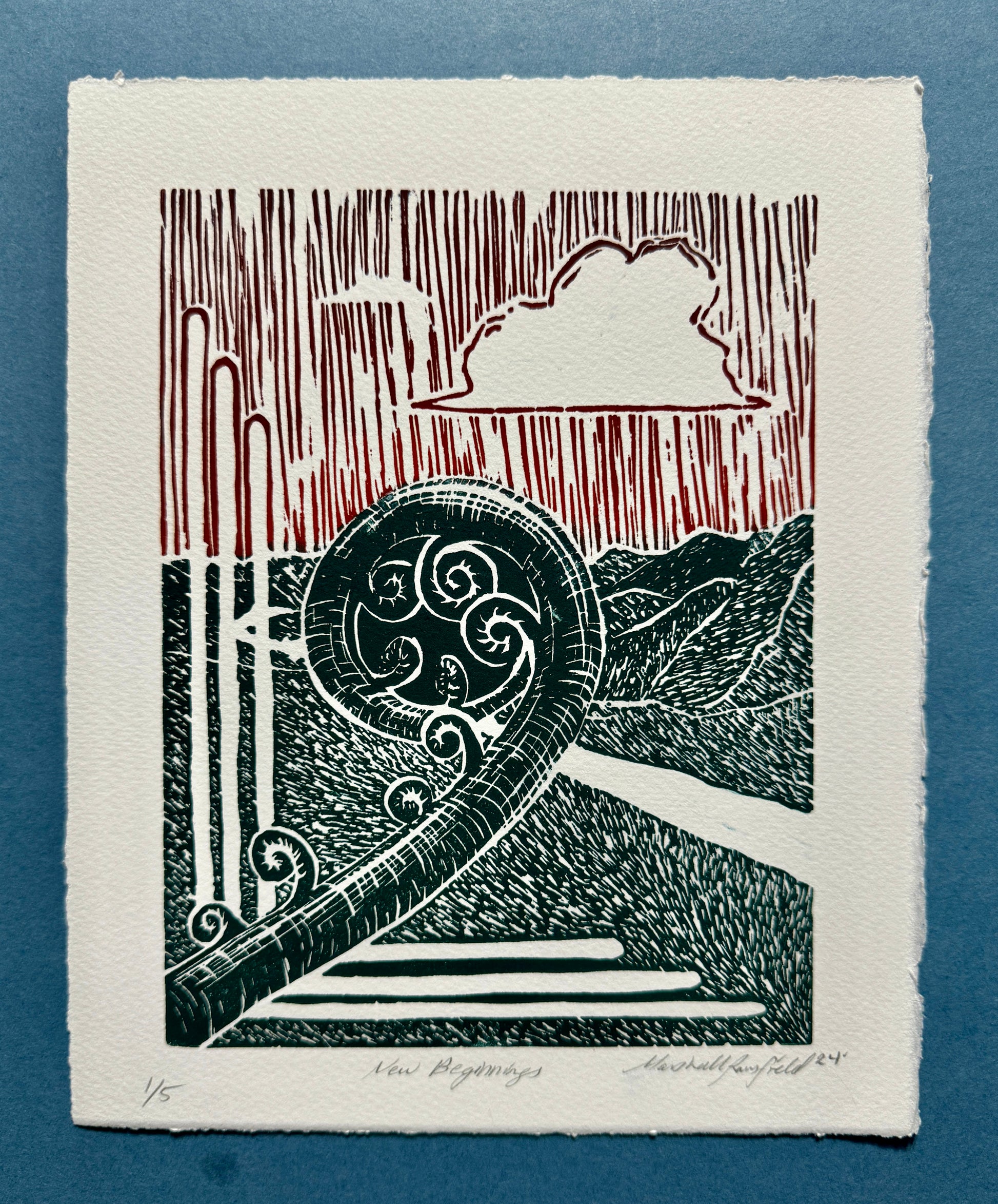 This is a beautiful lino print of the Whanganui River with a fern unfurling in the foreground.